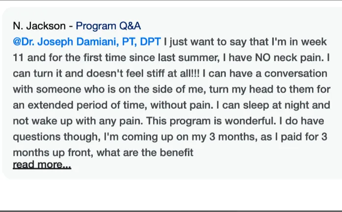 "My pain was always there. Dull, constant and when I would think about it, it would get worse. This program helped me because like the exercises, it just released that tension there."
