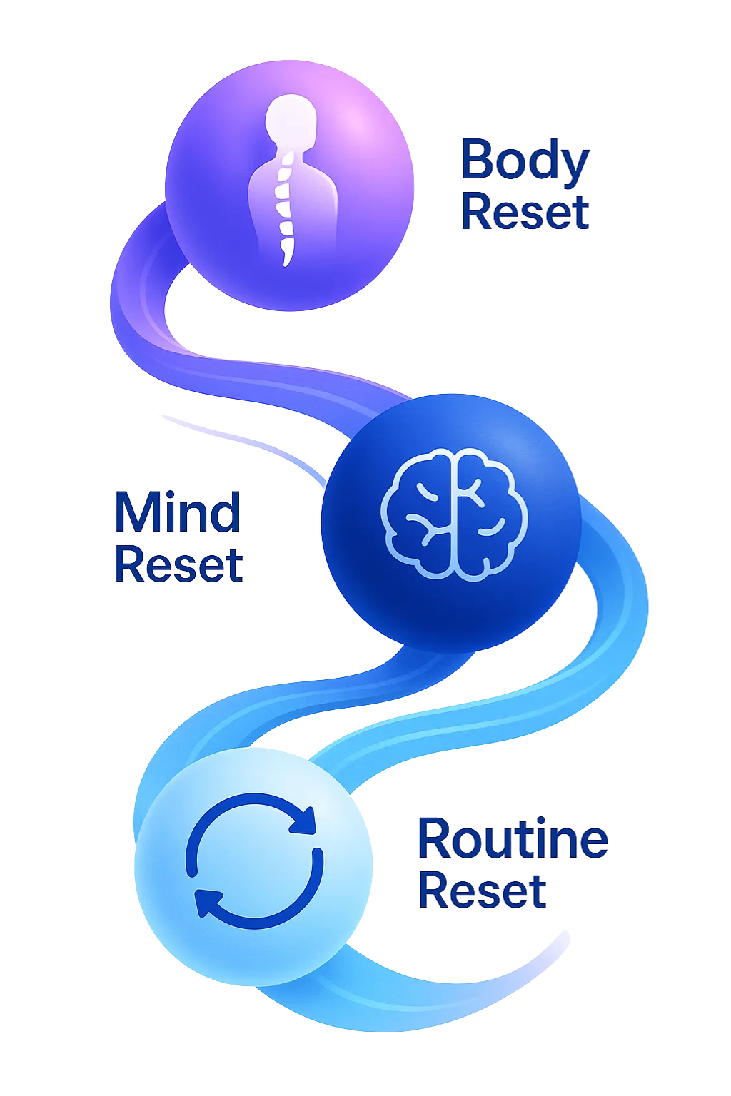 The Routine Reset fixes the daily habits fueling your pain. Your workspace setup. Your sleep position. The way you breathe during stress. Small tweaks that either reinforce your healing or undo it by the end of the day.